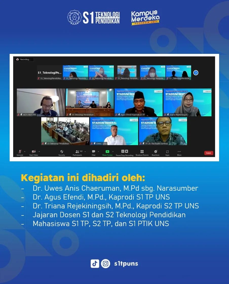 Kegiatan ini mengundang Bapak Dr. Uwes Anis Chaeruman, M.Pd. (Dosen UNJ) sebagai Narasumber; Kaprodi S1 TP UNS Bapak Dr. Agus Efendi, M.Pd.; Kaprodi S2 TP UNS Ibu Dr. Triana Rejekiningsih, M.Pd.; Jajaran Dosen S1 dan S2 Teknologi Pendidikan UNS; serta Mahasiswa S1 TP, S2 TP, dan S1 PTIK UNS