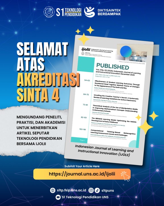 Surakarta, 14 April 2026 – Program Studi S1 Teknologi Pendidikan (S1TP) Fakultas Keguruan dan Ilmu Pendidikan (FKIP) Universitas Sebelas Maret (UNS) dengan bangga mengumumkan pencapaian terbaru bagi jurnal ilmiah kebanggaan kami, Indonesian Journal of Learning Innovation and Instruction (IJOLII). Berdasarkan Keputusan Direktur Jenderal Riset dan Pengembangan Nomor 156/C/C3/KPT/2026, IJOLII kini telah resmi terakreditasi Sinta 4.