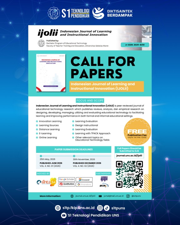 Sejalan dengan semangat peningkatan kualitas tersebut, IJOLII mengundang para akademisi, peneliti, praktisi, dan mahasiswa untuk mengirimkan naskah hasil penelitian terbaiknya. Kami fokus pada inovasi dalam bidang: Desain dan Pengembangan Instruksional, Media Pembelajaran Digital, Strategi Pembelajaran Inovatif, Evaluasi dan Manajemen Teknologi Pendidikan, dan bidang Teknologi Pendidikan lainnya.